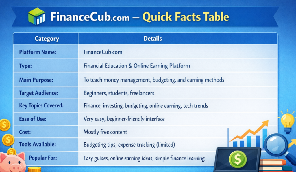 FinanceCub com is a platform made simple and beginner-friendly where the people can easily understand money in layman terms and practical terms. What makes the book unique is its plain English, practical references, and emphasis on everyday financial challenges. Note however that it is still not a serious finance platform. Find its benefit as a way to learn, not as a decision-maker for your finances. Whether you are a beginner, FinanceCub com will be a great first step on this journey of learning to better understand money smarter and better.